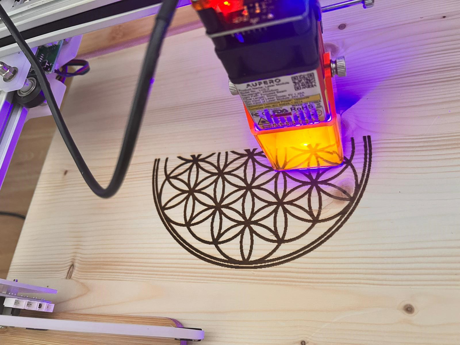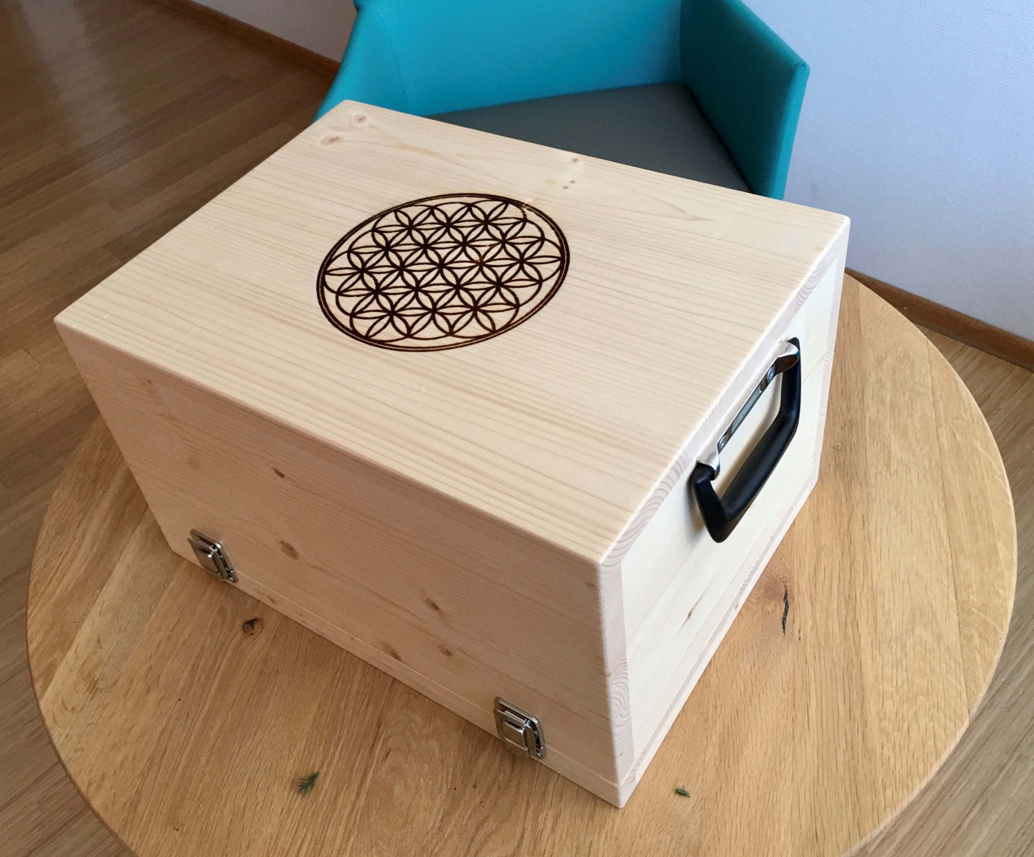 Die Abdeckungen der hausintern geschreinerten Boxen wurden teilweise im Rahmen der Kunsttherapie bemalt. Andere wiederum wurden mittels einer Laser-Maschine mit der sogenannten „Lebensblume“ versehen.