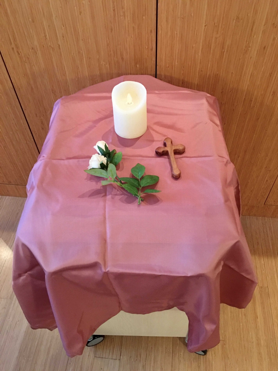 Holzkreuze, die ebenfalls in Handarbeit gefertigt und gespendet wurden, konnten von Klinik-Seelsorger*innen zur Verfügung gestellt werden. Zur Abrundung des Arrangements wurden LED-Kerzen und Stoff-Rosen von Mitgliedern des Ethikkomitees ausgesucht und besorgt.