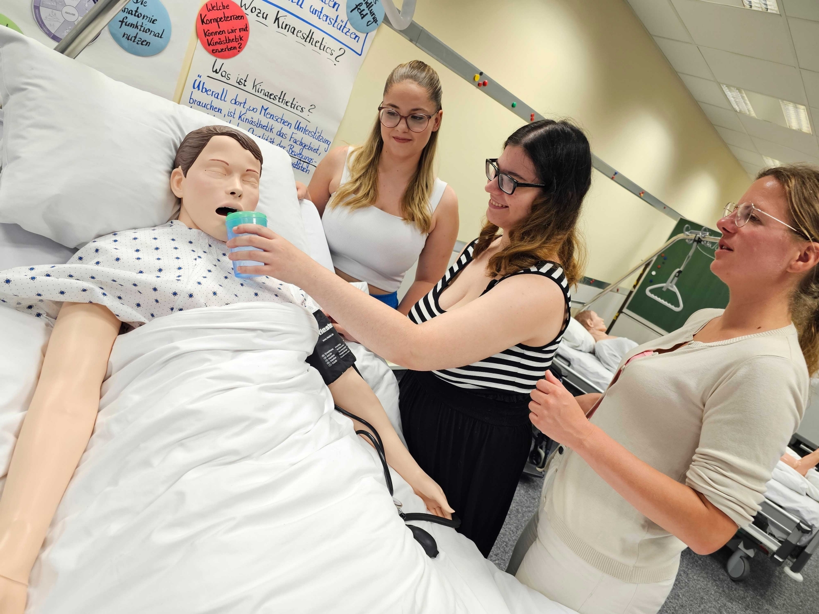 Pflegefachhelfer unterstützen die Patienten beim Essen, Waschen und Anziehen. Während der Ausbildung wird an einer Puppe geübt. Im Bild von rechts: Pflegepädagogin Melanie Amatruda mit den Pflegefachschülerinnen Melanie Manz und Lilly Tatka. Archivfoto: Häfele/Pressestelle Klinikum Memmingen