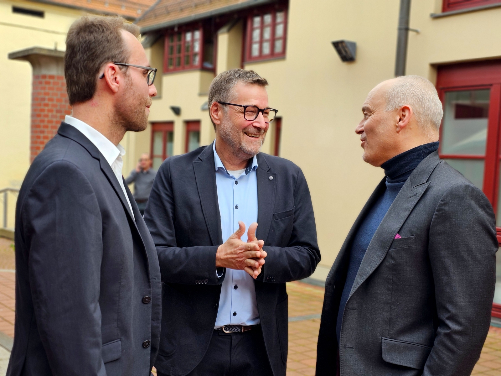 Im Rahmen der vom Klinikum Memmingen ausgerichteten Herbsttagung trafen sich vor dem Memminger Kolbe-Haus: Der Organisator und Leiter des Kindernierenzentrums am Klinikum Memmingen, Dr. Henry Fehrenbach (Mitte), der Präsident der Technischen Hochschule Augsburg, Prof. Dr. Gordon Rohrmair (rechts), und PD Dr. Stefan Kohl von der Kinderklinik der Universität Köln (links). Fotos: Eva Maria Häfele/Pressestelle Klinikum Memmingen