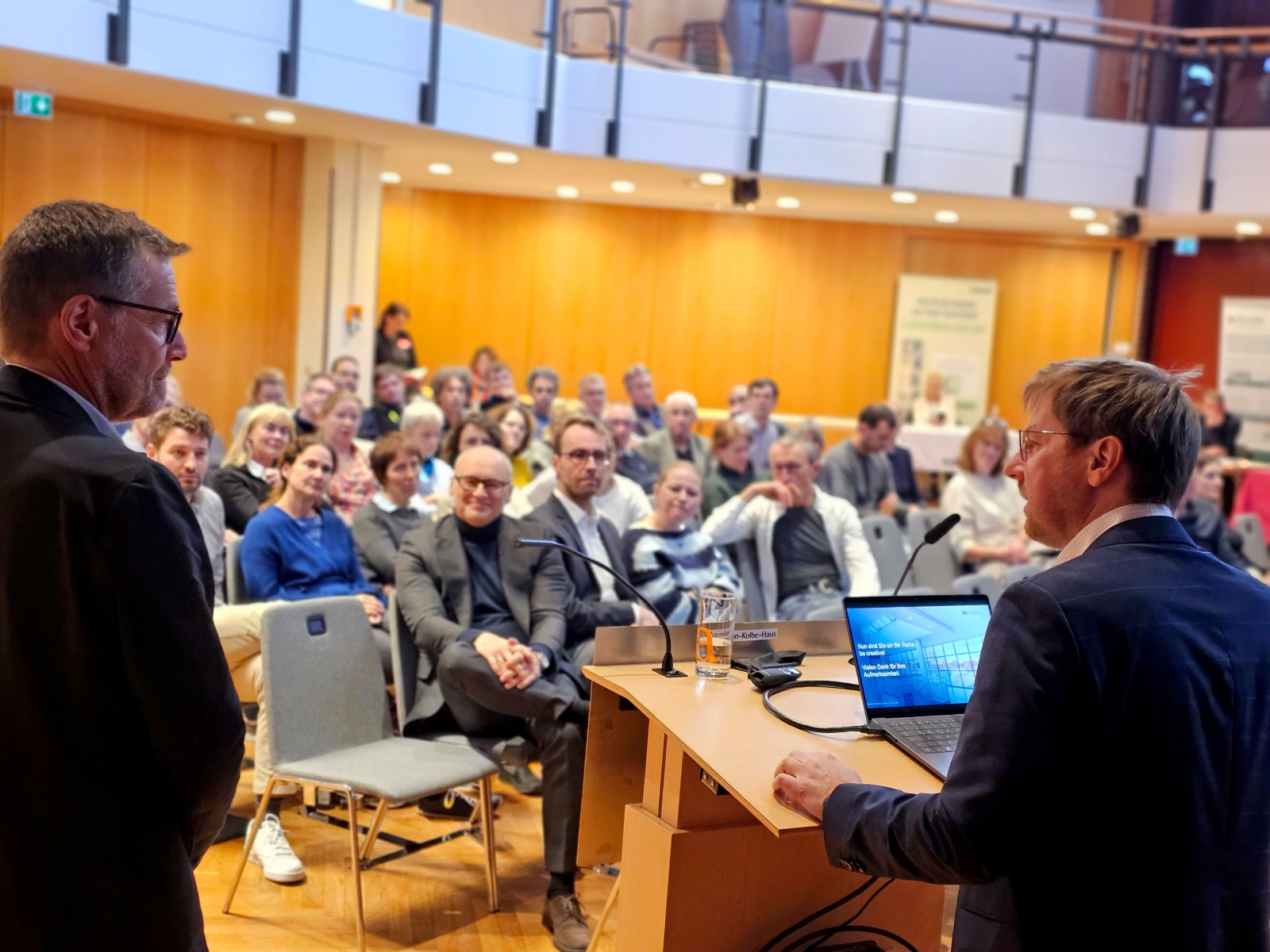 Prof. Dr. Christoph Schmaderer (rechts) am Rednerpult im Maximilian-Kolbe-Haus.