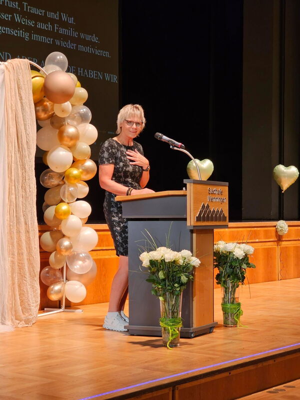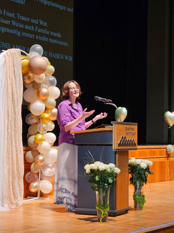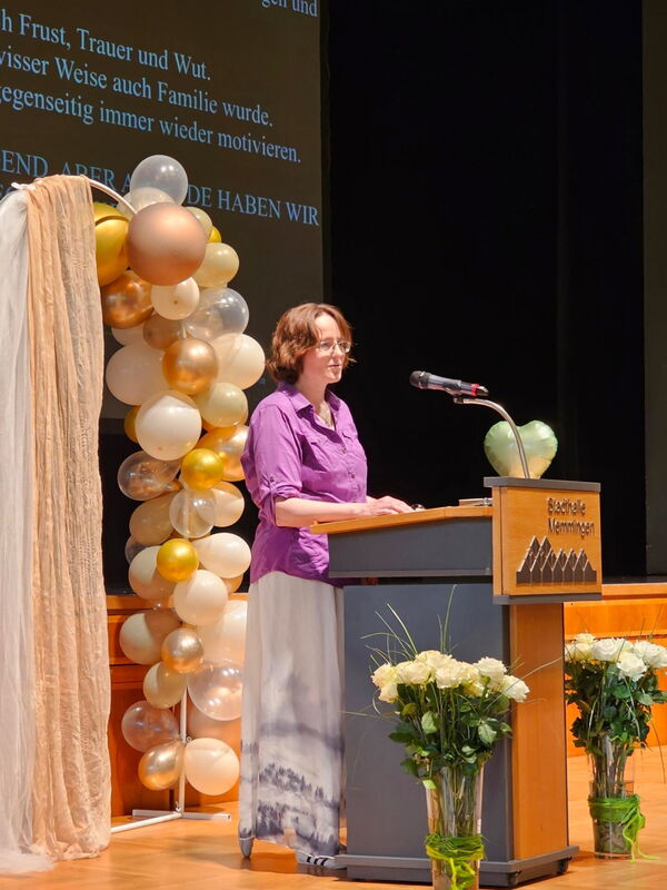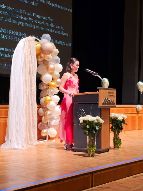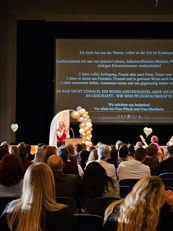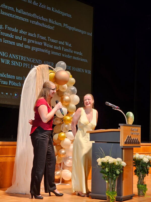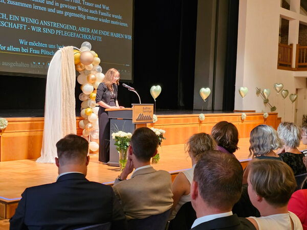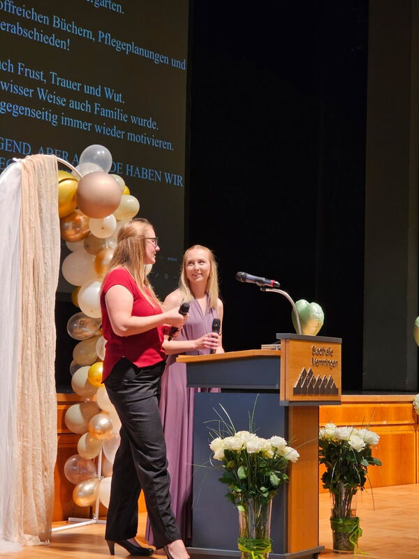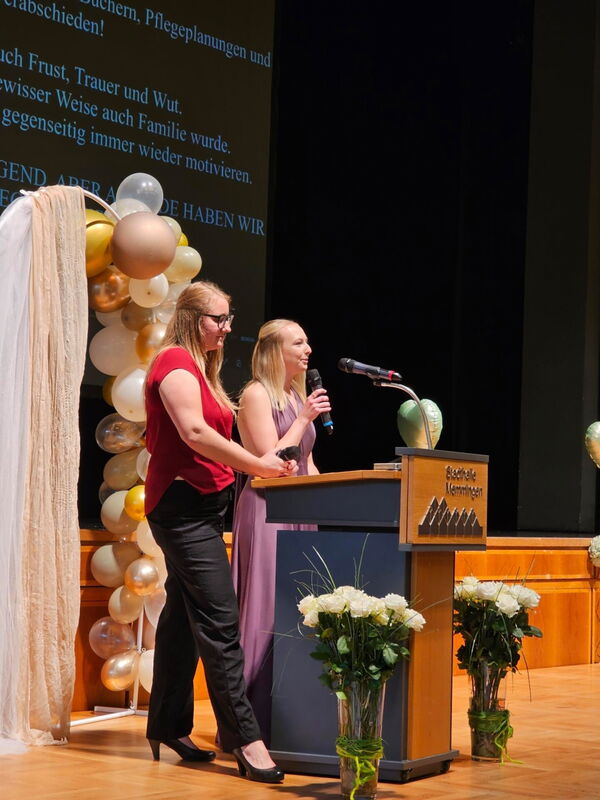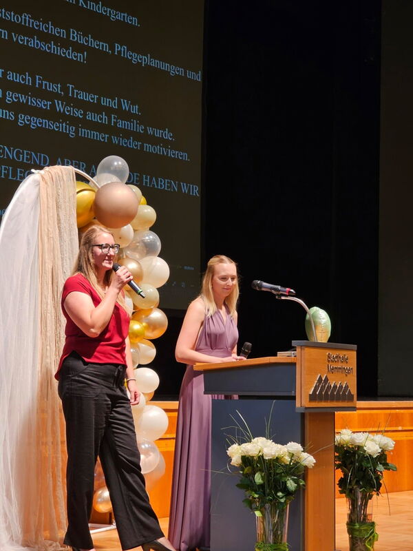 Absolventin Veronika Popp blickte in einer emotionalen Rede auf die vergangenen Ausbildungsjahre zurück: „Wir haben gelernt, wie man mit dem Herzen hält, wenn Worte fehlen und stehen hier mit Stolz, Hoffnung und Zuversicht.“ Absolventin Sophia Bischof dankte in ihrer Rede den „Lehrkräften, die uns durch Höhen und Tiefen begleitet und auch mal ein Auge zugedrückt haben“.