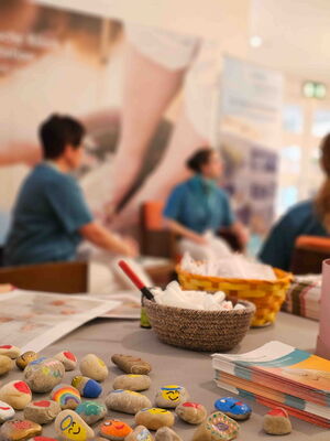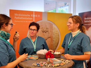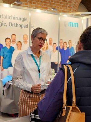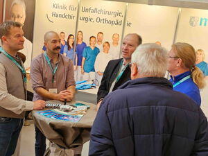 Einige Meter weiter konnten die Besucher am Stand der Diabetesberatung eine fast schmerzfreie Blutzuckermessung durchführen lassen und sich über die Stoffwechselstörung informieren, die unentdeckt und unbehandelt Grundlage vieler Erkrankungen ist. Das Medizinische Versorgungszentrum (MVZ) des Klinikums stellte sein haus- und fachärztliches Behandlungsangebot vor, der Klinikförderverein präsentierte seine Arbeit zugunsten des Krankenhauses und die Klinik für Unfallchirurgie, Handchirurgie und Orthopädie informierte über den künstlichen Gelenkersatz an Hüfte und Knie, sowie über Behandlungsoptionen an der Hand. Am Stand der Palliativstation des Klinikums konnten sich die Messebesucher einen Eindruck von der Arbeit auf Station machen und sich mit kleinen Aufmerksamkeiten verwöhnen lassen.