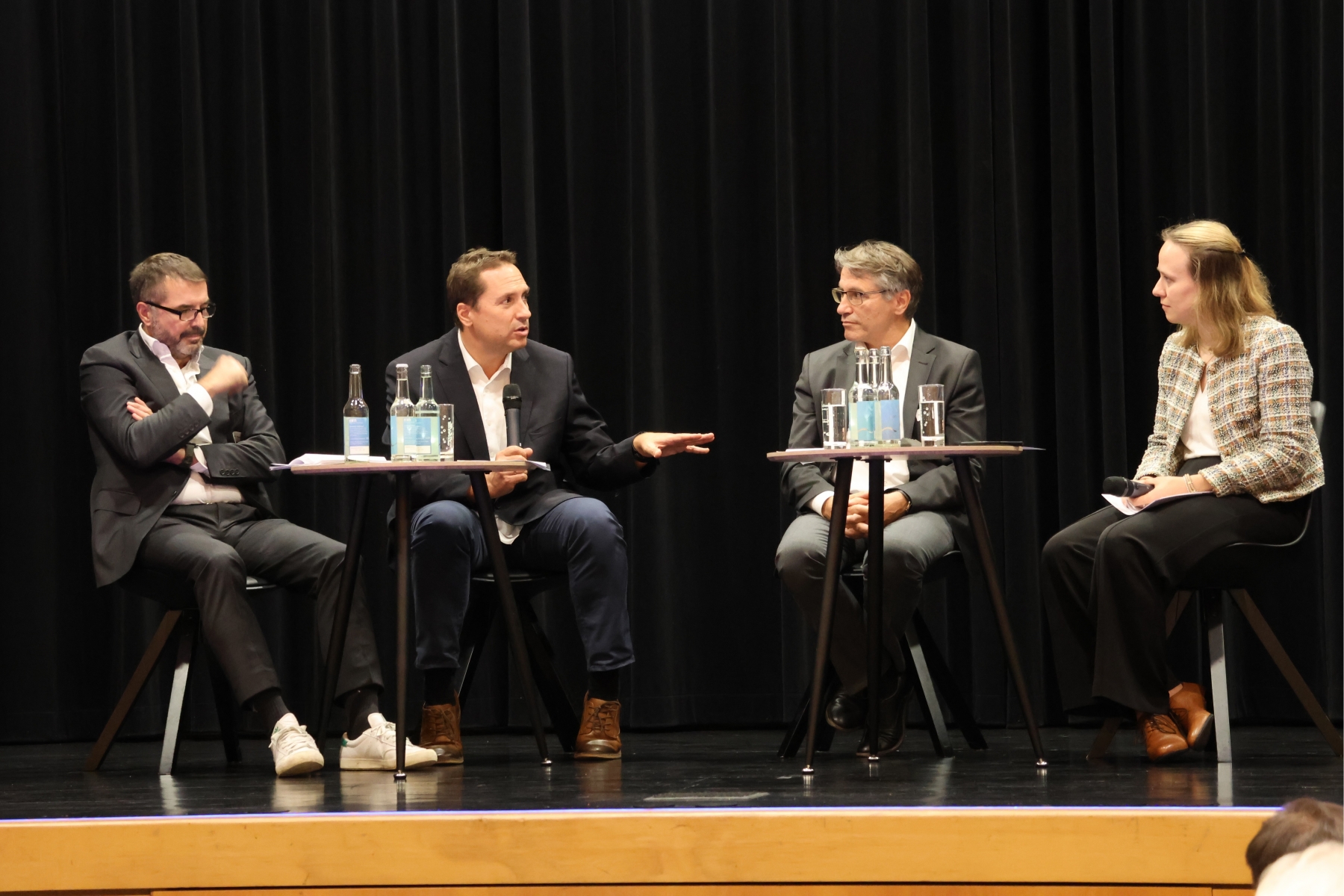 Auf dem Podium (von links): Prof. Dr. Peter Biberthaler, Prof. Dr. Florian Holzapfel, Prof. Dr. Franz Benstetter und Moderatorin Nicola Galm. Foto: A. Wehr/Pressestelle Stadt Memmingen