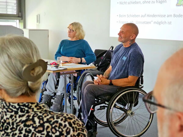 Beim Pflegetag im Klinikum Memmingen erzählten Menschen mit Behinderung von ihren individuellen Bedürfnissen. Im Bild (von links): Die Vorsitzende des Memminger Behindertenbeirats Verena Gotzes und Referent Peter Czech, der wie Verena Gotzes Rollstuhlfahrer ist. Foto: Eva Maria Häfele/Pressestelle Klinikum Memmingen