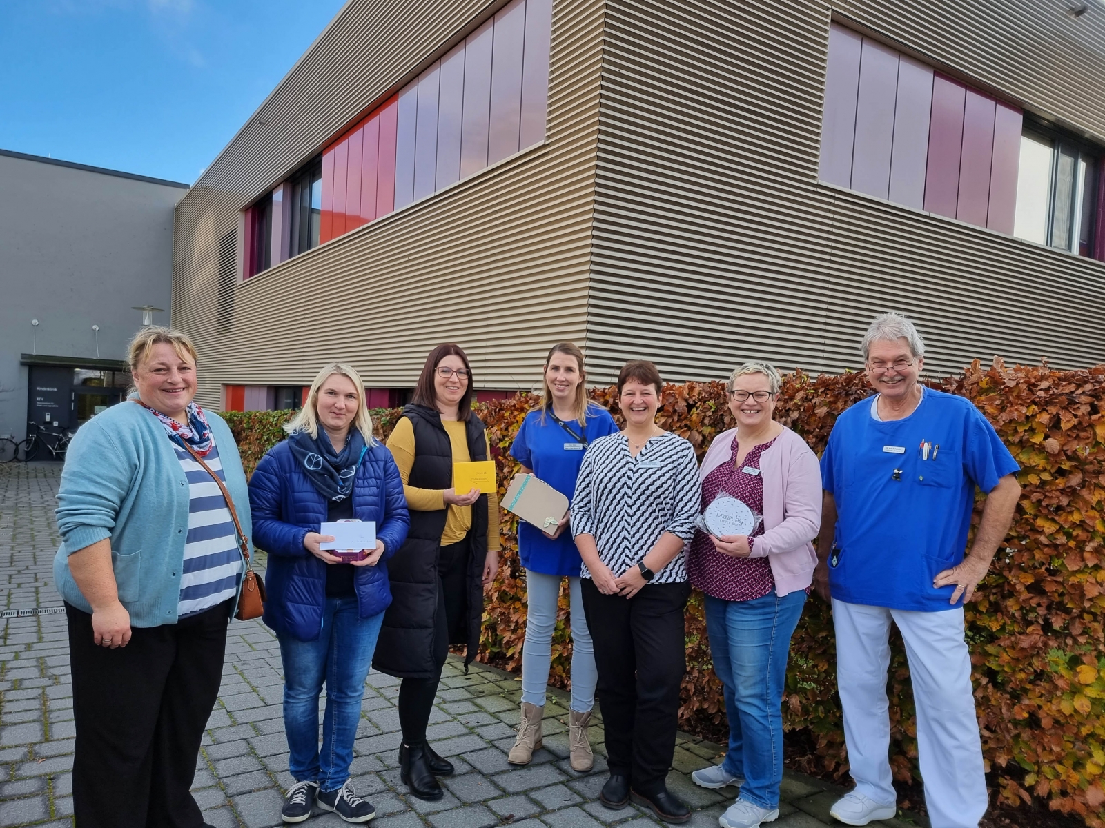 Bei der Spendenübergabe vor dem Gebäude der Kinderintensivstation (von links): Johanna Maurus, Marion Stempfle-Betz und Bianca Endriß vom Westerheimer Basar-Team, Sonja Schalk (Kinderkrankenschwester Palliativpflege) mit einem Erinnerungsköfferchen, Michaela Nürnberger (Bereichsleitung Kinderklinik), Renate Olbrich (Stationsleitung Kinderintensiv) und Dr. Ralf Pallacks (Leiter Neonatologie). Foto: Häfele/Pressestelle Klinikum Memmingen