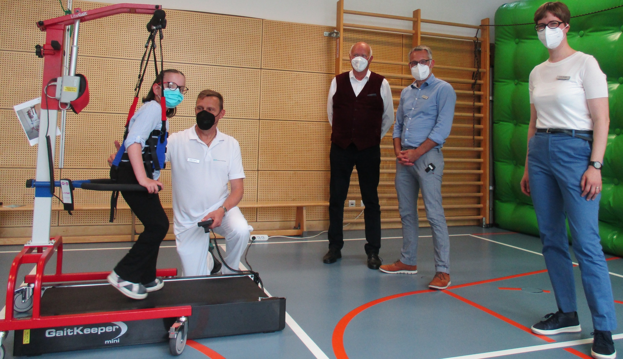 Das „LiteGait®“ ist ein Trainingsgerät für das Gehtraining bei Kindern und Jugendlichen. Es sorgt für sichere Unterstützung und Gewichtsentlastung beim Gangtraining. Das Gehtraining erfolgt zum Beispiel mit dem „GaitKeeper®“ - einem speziellen Laufband - oder auf dem Boden. Weil durch das Gurtsystem Stürze verhindert werden fördert das Training die Sicherheit und das Selbstvertrauen der kleinen Patientinnen und Patienten. Das Laufband ist eine große Hilfe für die Physiotherapeuten bei der Diagnostik von Gangauffälligkeiten und unterstützt sie bei der optimalen Versorgung der Kinder mit Hilfsmitteln.