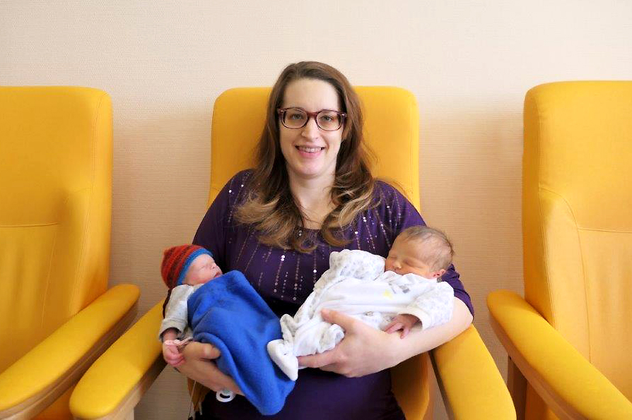 Mutter Daniela Stein mit ihren Töchtern Evelin (links) und Amelie, die am vergangenen Wochenende zusammen mit drei weiteren Zwillingspärchen im Klinikum Memmingen zur die Welt gekommen sind. Foto: Klinikum Memmingen