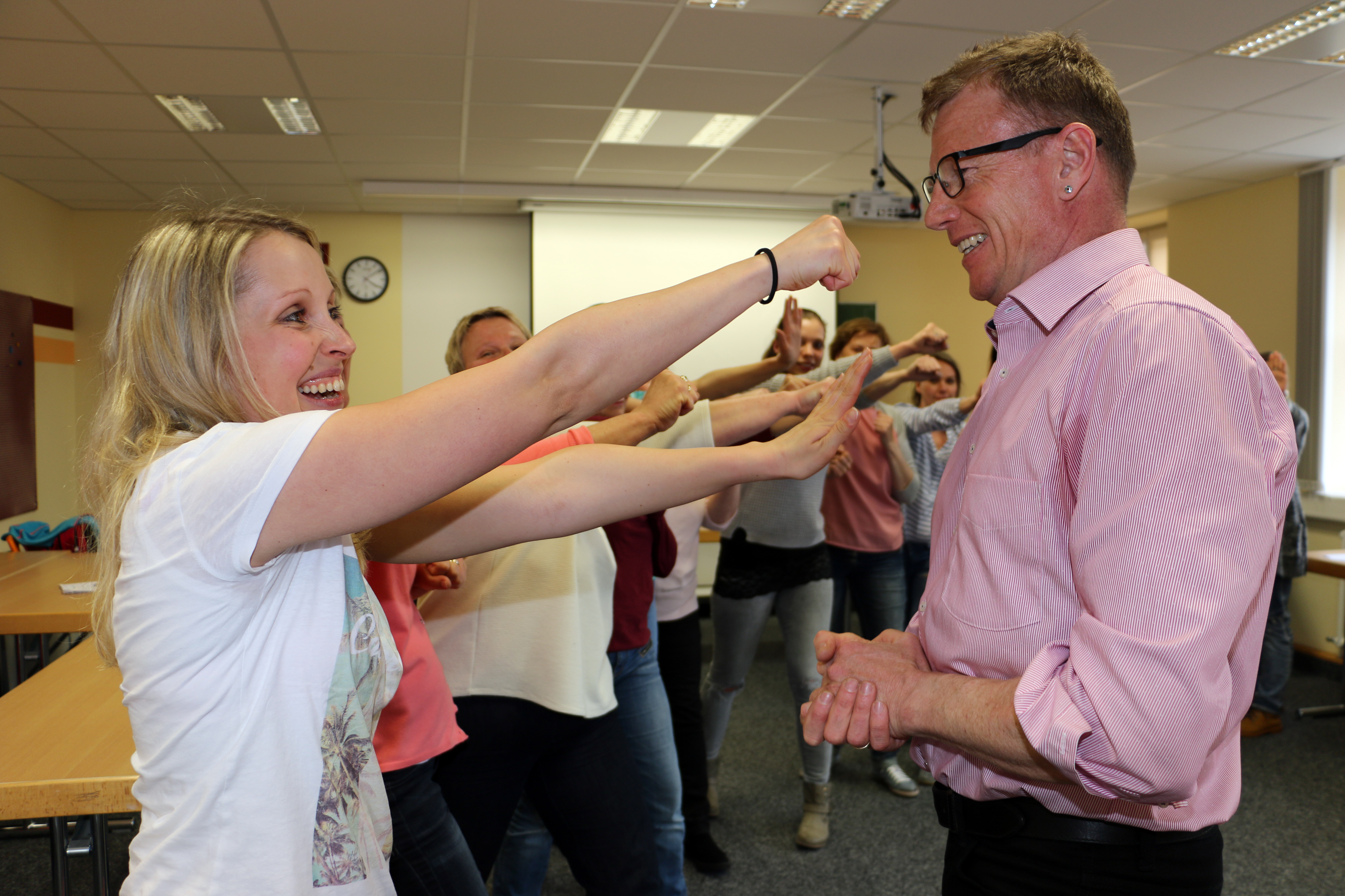 Die Faust zielt direkt auf das Gesicht des Angreifers. Der folgende Knieschlag soll die empfindliche Stelle zwischen den Beinen treffen. Das kann wehtun. Doch hier handelt es sich um ein Training. Die imaginären Opfer und Täter sind Pflegekräfte des Klinikum Memmingen, die in einem Seminar üben, sich gegenüber Patienten, die handgreiflich werden, zu verteidigen.