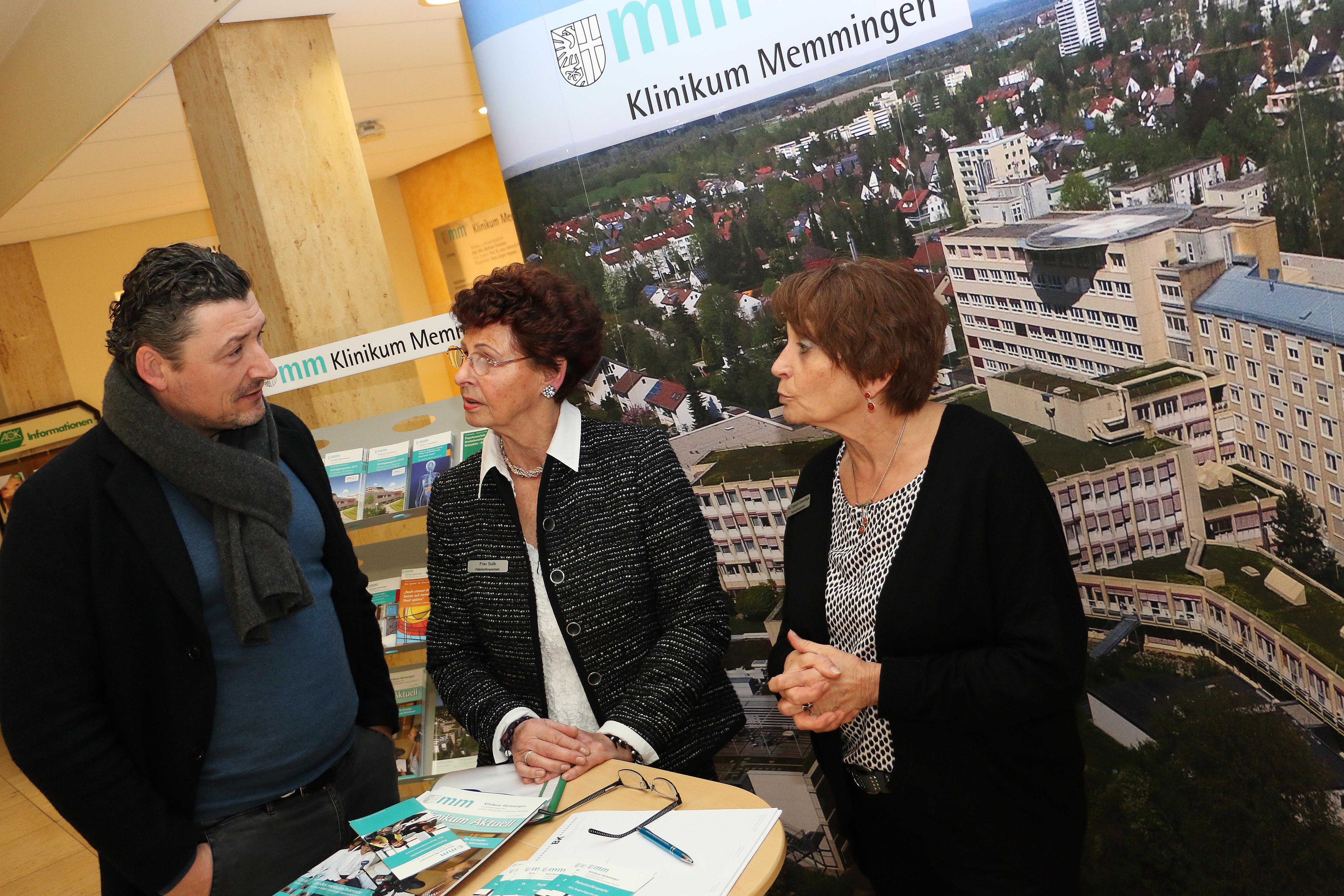 Die Patientenfürsprecherinnen des Klinikum Memmingen, Edeltraud Sulik (Mitte) und Margot Trojanzick-Schwerdtfeger (rechts), informierten anlässlich des bundesweiten Aktionstages zum Wohle der Patienten die Besucher (im Bild Christian Spiegel) im Klinikfoyer über ihre Arbeit. Foto: Häfele/Pressestelle Klinikum Memmingen