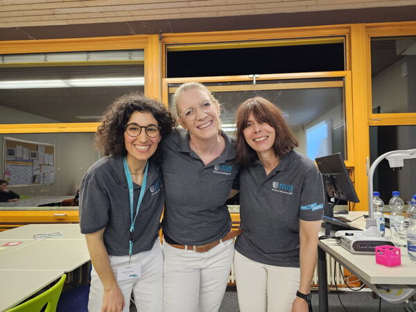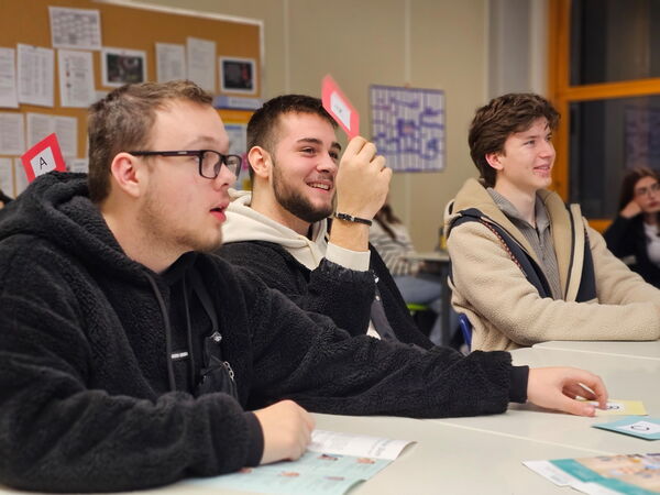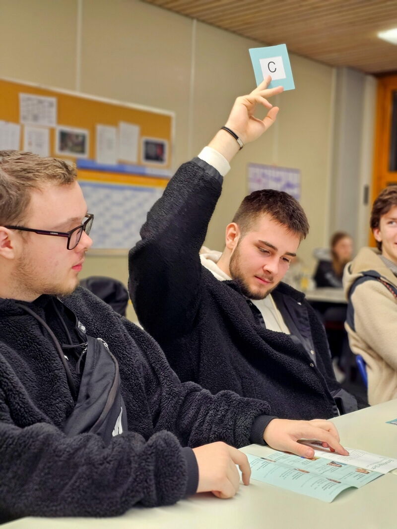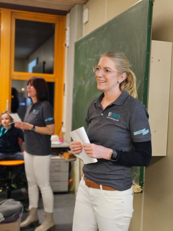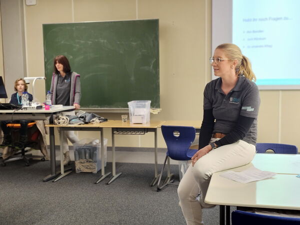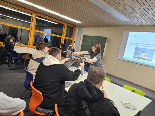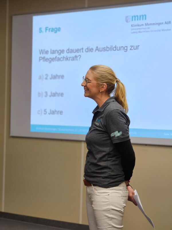 Wer weiß am besten über das Klinikum Memmingen Bescheid? Bei einem spannenden Klinik-Quiz auf der „Ausbildungsmesse light“ im Berufsbildungszentrum Jakob Küner stellten Personalleiterin Rike Rau (Bildmitte) und ihre Kollegin Barb Herzner (dahinter) knifflige Fragen an die Neunt- und Zehntklässler und gaben dabei interessante Einblicke in das Krankenhaus und seine verschiedenen Berufsfelder.