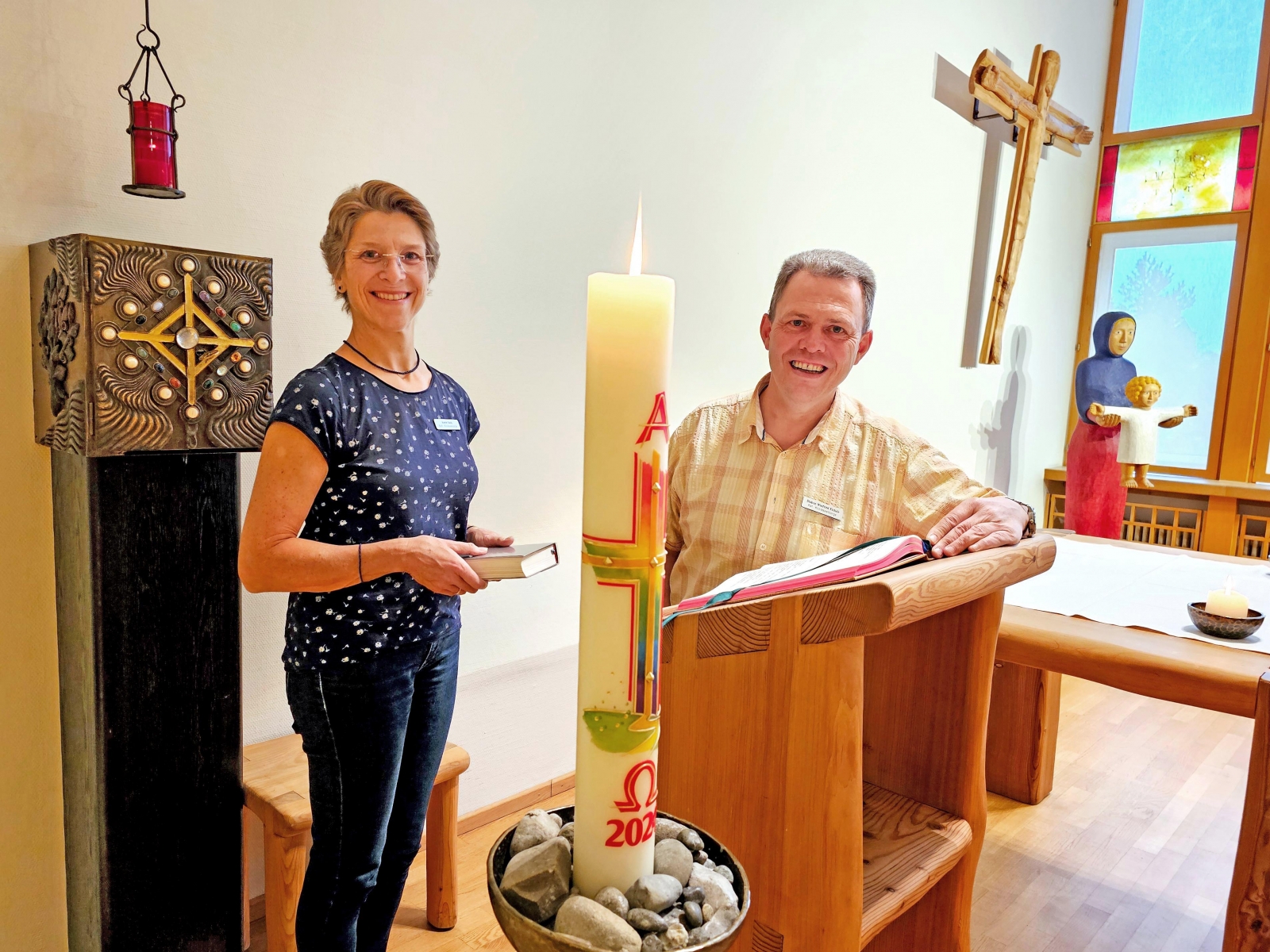 In der Kapelle im zweiten Stock des Klinikums treffen Diakon Winfried Eichele (rechts) und Pastoralreferentin Anette Stark (links) Vorbereitungen für einen Gottesdienst. Foto: Eva Maria Häfele/Pressestelle Klinikum Memmingen