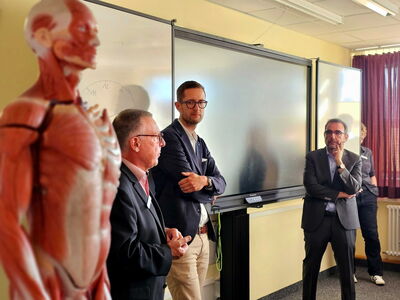 CSU-Politiker Klaus Holetschek besuchte in der Berufsfachschule für Pflege des Klinikums Memmingen Schülerinnen und Schüler der generalistischen Pflegeausbildung und sprach mit ihnen über ihre Berufswünsche und Zukunftsperspektiven.