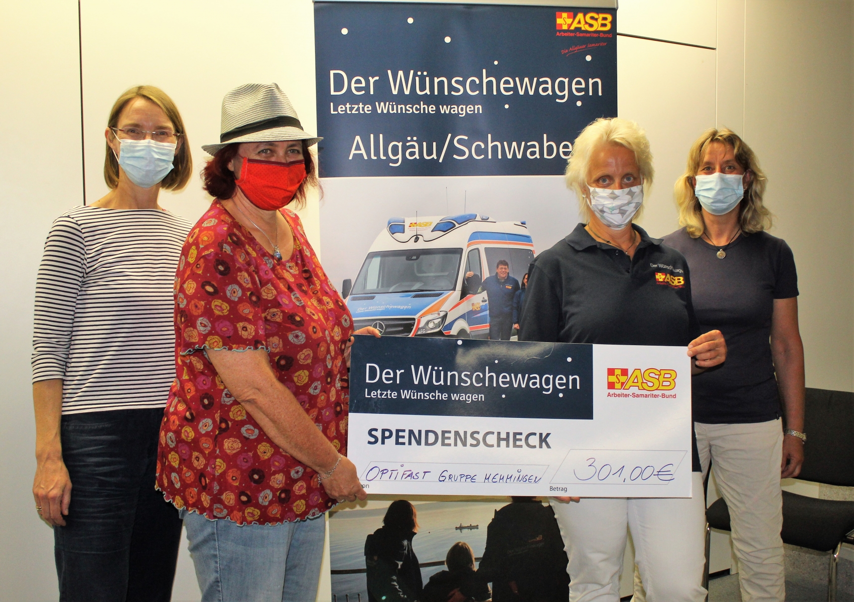 Das eigene Übergewicht bekämpfen und dabei noch Gutes tun: Die Optifast-Teilnehmer des Klinikum Memmingen haben für jedes verlorene Kilo Körpergewicht einen Euro gespendet. Die so erzielte Summe in Höhe von 301 Euro haben sie an den „Wünschewagen“ des Arbeiter- Samariter- Bundes (ASB) gespendet. Mit dem Fahrzeug wird schwerstkranken Menschen, die an ihrem Lebensende stehen, ein letzter Herzenswunsch erfüllt. Im Bild (von links): Ernährungsberaterin Sonja Eichin, Teilnehmerin Gaby Schmid, Uta Firnhaber vom ASB und Optifast-Programmleiterin Heidi Müller vom Memminger Klinikum. Foto: Mutzel