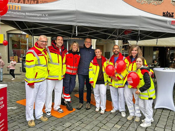 Anlässlich der Woche der Wiederbelebung erklärten Mitarbeitende des Klinikums Memmingen Passanten am Memminger Marktplatz die Herz-Druck-Massage. Im Bild von links: Anästhesie-Chefarzt Prof. Dr. Lars Fischer, Oberarzt Dr. Christian Weidmann, Oberärztin Dr. Lara Maria Sturm, Stadtrat Matthias Reßler und Oberbürgermeister Jan Rothenbacher (vorne). Fotos: Laupheimer/Klinikum Memmingen