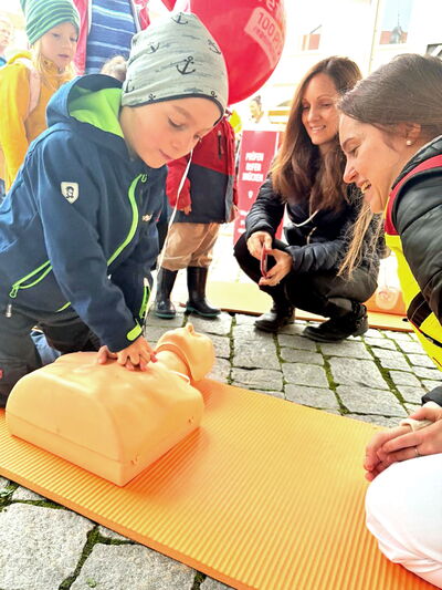 Auch Kinder und Jugendliche waren heuer beim Aktionstag ausdrücklich willkommen. Im Bild übt der kleine David die Herz-Druck-Massage an einer Übungspuppe.