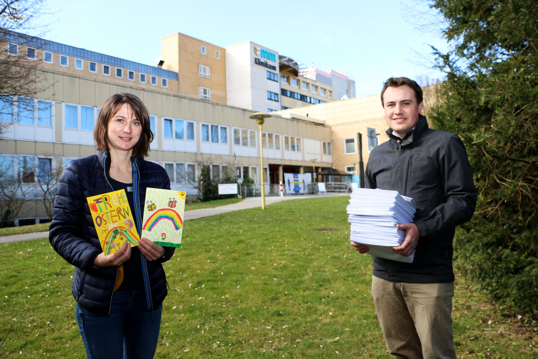 Osterhasen, Blumen, Schmetterlinge – Gut 250 Kinder haben im Religionsunterricht Genesungskarten für Patienten des Memminger Klinikums gestaltet. Die kunterbunten Grußkarten zu Ostern sollen jetzt, bei eingeschränkten Besuchsmöglichkeiten während der Corona-Pandemie, den Patienten eine Freude bereiten. Mit einem großen Dank an die fleißigen jungen Künstler verschiedener Memminger Schulen haben Pfarrer Severin Brodersen von der evangelischen Klinikseelsorge und Christina Taffe von der katholischen Klinikseelsorge die Karten für die Verteilung auf den verschiedenen Stationen des Memminger Klinikums vorbereitet. Foto: Häfele/Klinikum Memmingen