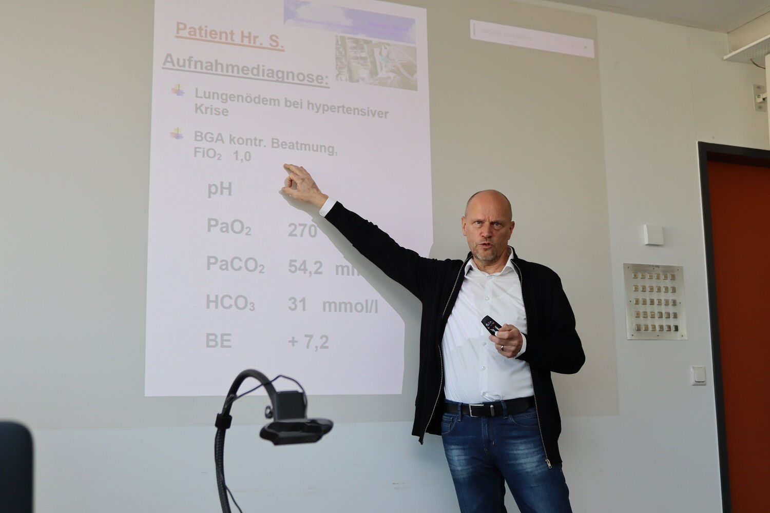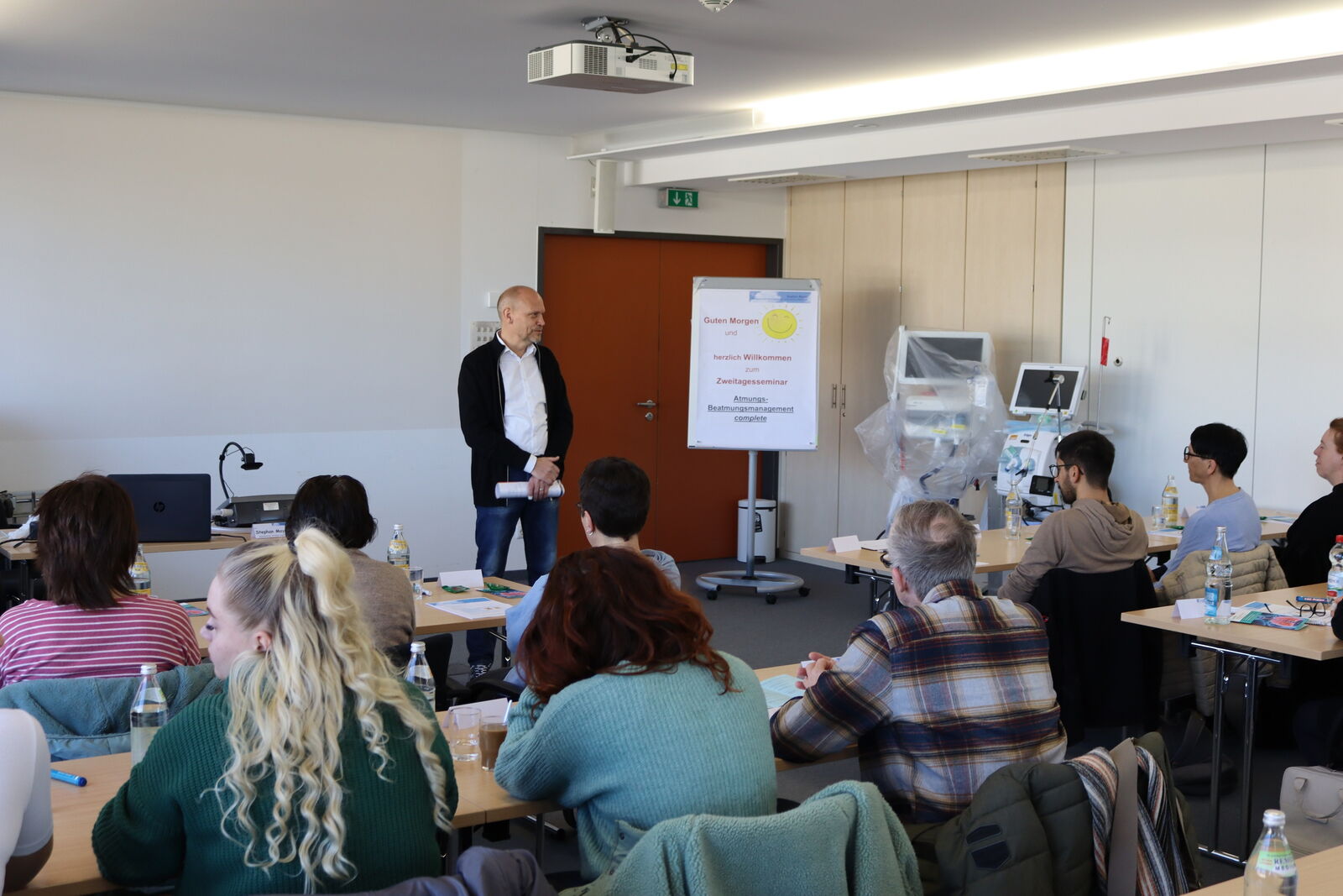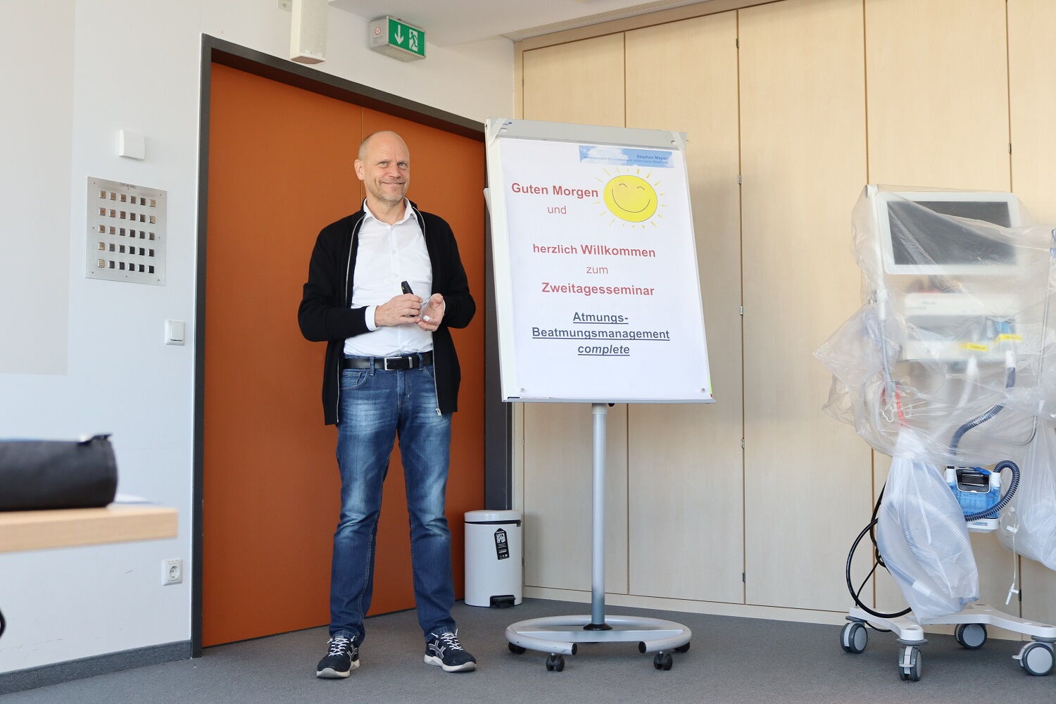 Referent Stephan Mayer von der Uniklinik Augsburg beim Vortrag zum Thema „Atmungs- und Beatmungsmangement complete“. Der Atemtherapeut (DGP) und Klinikspezialist für invasive und nicht invasive Beatmung hält am Klinikum Memmingen ein Zweitagesseminar.