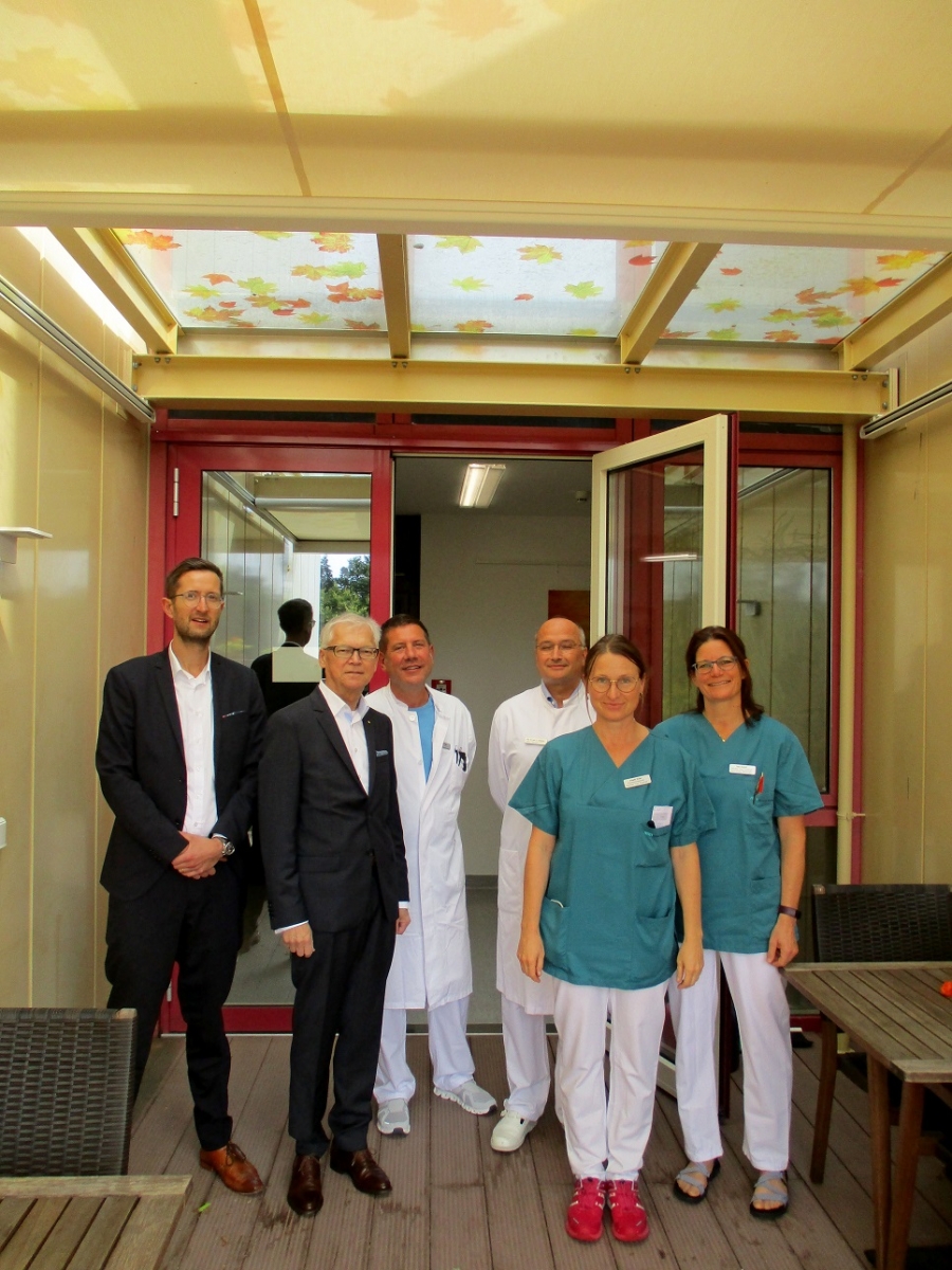 Unter der neuen Markise stehend von links: Maximilian Mai, Vorstand Klinikum Memmingen, Dr. Walter Hofmann, ehem. Chefarzt der Abteilung für Pathologie und stellvertretender Vereinsvorsitzender, Dr. Thomas Luttenberger, Oberarzt der Inneren Medizin II, Prof. Dr. Eike Gallmeier, Chefarzt der Medizinischen Klinik II, Angela Huber, Palliative Care Fachkraft, Ines Rudolf, Stationsleitung der Palliativstation.
