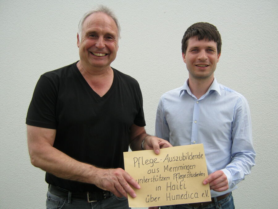 Herr Beer überreichte im Namen der Berufsfachschule für Pflege des Klinikums Memmingen A.ö.R. eine Spende von 750 € an den geschäftsführenden Vorstand von Humedica e.V., Herrn Johannes Peter (rechts im Bild). Dieser leitet die Spende direkt an die Schulleiterin der Partnerschule in Haiti, Mrs. Gladys Thomas, weiter. Sie setzt das Geld gezielt für die Ausbildung von jungen Menschen in Haiti zur Pflegefachkraft ein.