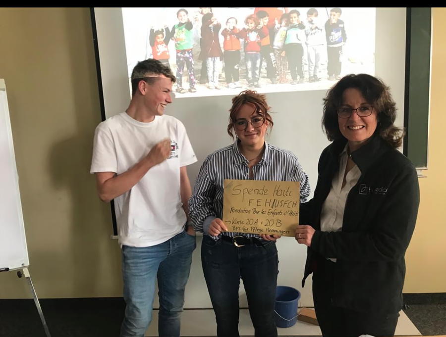 Die Klassensprecher*innen der Kurse 20 A und 20 B Mila Merz und Jonas Brugger überreichten Frau Heinke Rauscher (rechts im Bild), Vorständin von HUMEDICA e.V., einen Umschlag mit einer Spende in Höhe von 850,00 € zur Unterstützung der Partnerschule in Haiti. Seit 2016 unterstützen die Auszubildenden der BFS für Pflege über HUMEDICA die Einrichtung in Haiti, um die Berufschancen jungen Menschen und die pflegerische Versorgung insgesamt auf der Karibikinsel stetig zu verbessern.