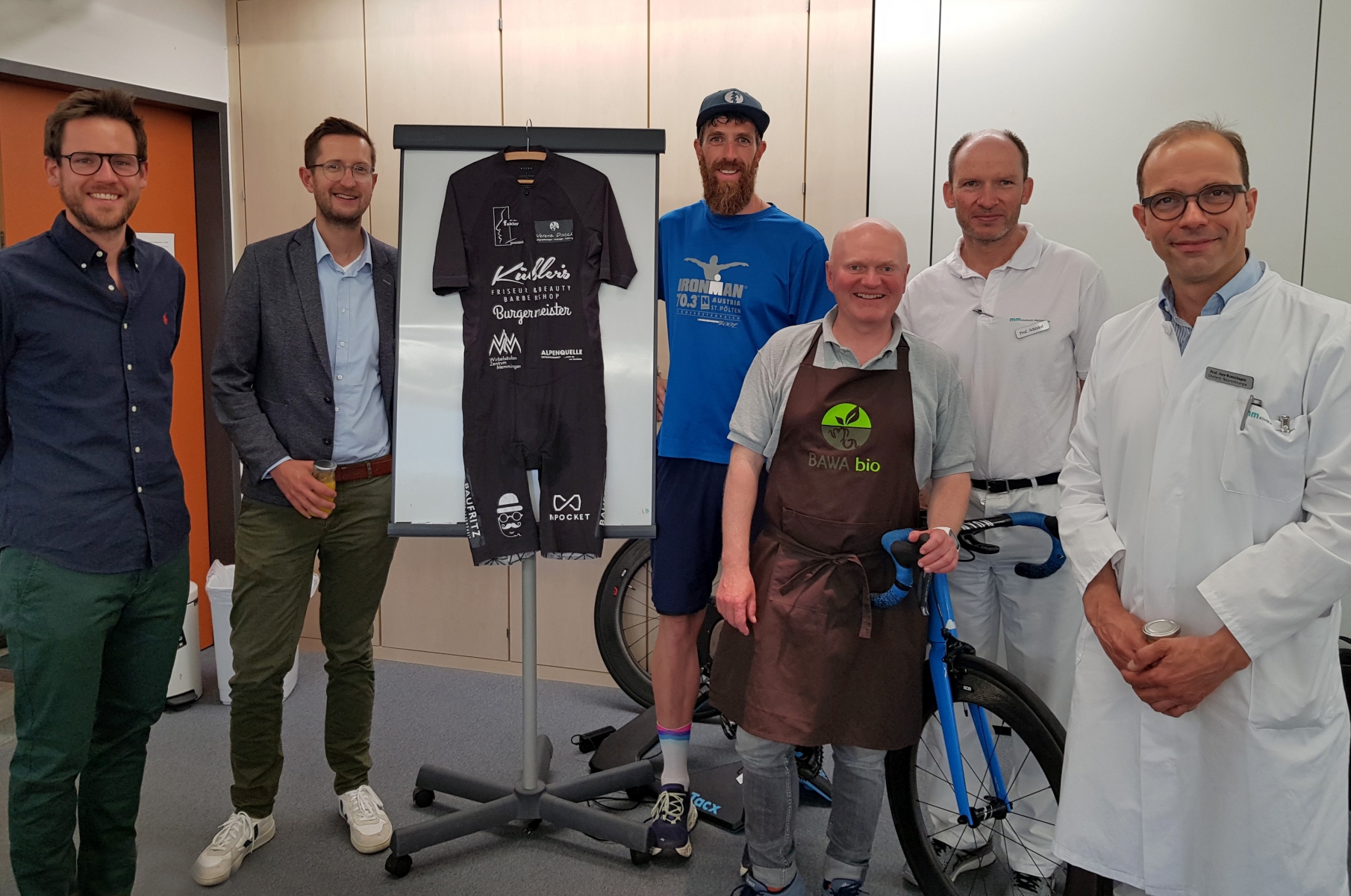 Im Bild (von links): Dr. Johannes Meyer (Sekretär Wirbelsäulenzentrum), Klinikvorstand Maximilian Mai, Triathlet Darren Alcock, Peter Huber (vom Hof-Lagerverkauf Bawa bio), Unfallchirurgie-Chefarzt Prof. Dr. Christian Schinkel und Neurochirurgie-Chefarzt Prof. Dr. Marcel Seiz-Rosenhagen (Leiter Wirbelsäulenzentrum). Foto: Klinikum Memmingen