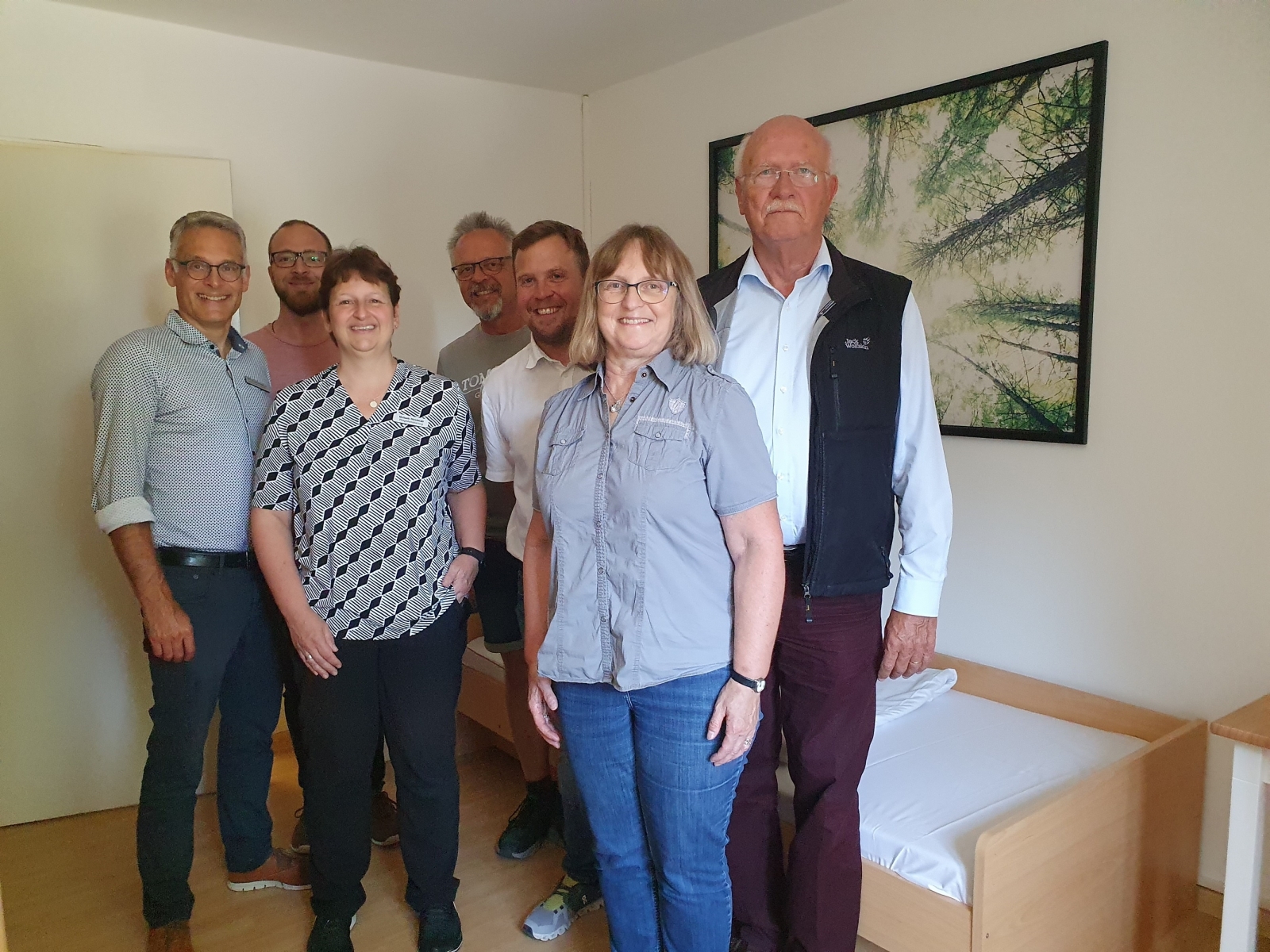 Bei der Besichtigung der neuen Elternzimmer (von links): Prof. Dr. David Frommhold (Chefarzt der Klinik für Kinder- und Jugendmedizin), Andreas Bilgeri (Freiwillige Feuerwehr Benningen), Michaela Nürnberger (Pflegedienstleitung), Herbert Vogler (Schützenverein Benningen), Martin Mayer (Theaterverein Benningen), Gabriele Jankowski (Gartenbauverein Benningen), Prof. Rainer Burghard (Vorsitzender Verein der Freunde und Förderer Klinikum Memmingen) Foto: Bitzer/Klinikum Memmingen