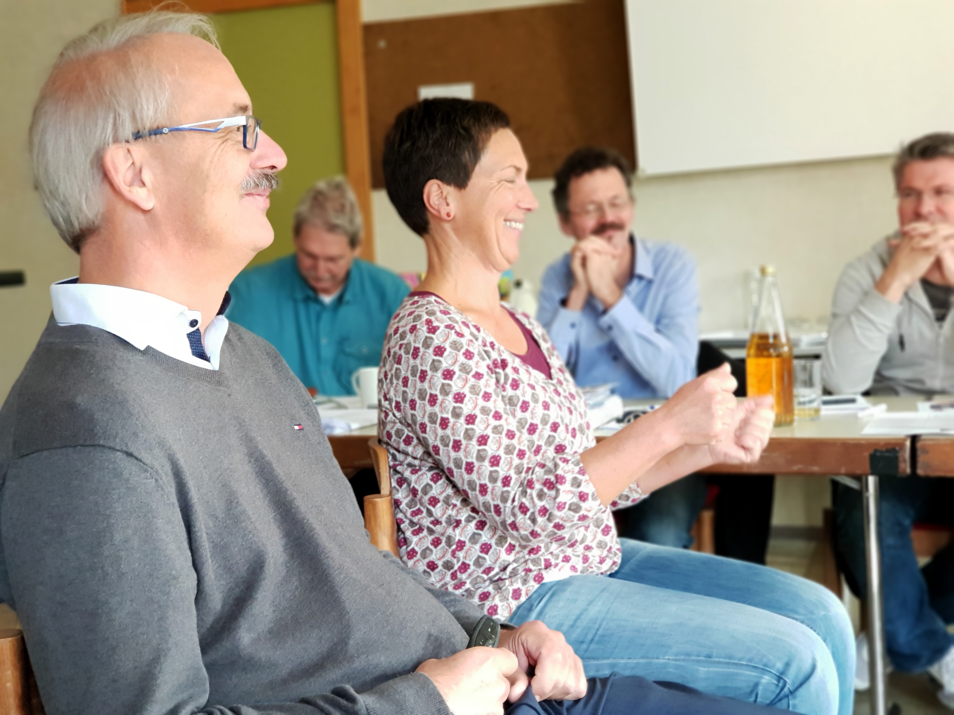 Wie spreche ich als Klinikmitarbeiter verständnisvoll, stressfrei und zielführend mit Patienten und Angehörigen, auch wenn es um schwierige Themen geht? Das war eine der zentralen Fragen bei der Jahrestagung des Ethikkomitees des Klinikum Memmingen im Kloster Bonlanden. Dabei erläuterte der Mönchengladbacher Chefarzt und Kommunikationstrainer Prof. Dr. Wolfgang Kölfen (vorne im Bild), wie wichtig gute Kommunikation im Krankenhaus für den Behandlungserfolg und die Zufriedenheit aller ist. „Vertrauen ist die Grundbasis, dass gute Kommunikation funktioniert“, erläuterte Kölfen. „Wenn die Beziehungsebene zum Patienten stimmt, können Sie die Sachinformation besser rüberbringen.“ Wie gute und effektive Gesprächsführung dagegen ganz und gar nicht funktioniert, erläuterte Kölfen an unterhaltsamen Beispielen wie einer Autofahrszene, in der es zum Geschlechterkampf zwischen Mann und Frau kommt (im Bild: Ethikkomitee-Mitglied Doris Huith). Das Ethikkomitee des Klinikum Memmingen wurde vor drei Jahren gegründet und besteht aus Mitgliedern verschiedener Berufsgruppen, die sich mit schwierigen ethischen Fragestellungen im Klinikalltag beschäftigen. Foto: Häfele/Pressestelle Klinikum Memmingen