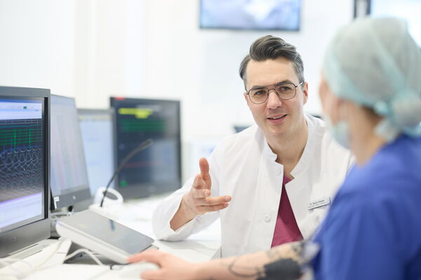 Oberarzt Dr. Daniel Zimmer: Die Behandlung von Vorhofflimmern zielt darauf ab, den normalen Herzrhythmus wiederherzustellen und die Herzfrequenz zu kontrollieren. Sicher und effektiver als mit einer medikamentösen Therapie lässt sich die Rhythmusstörung mit Hilfe eines minimalinvasiven Kathetereingriffs behandeln.