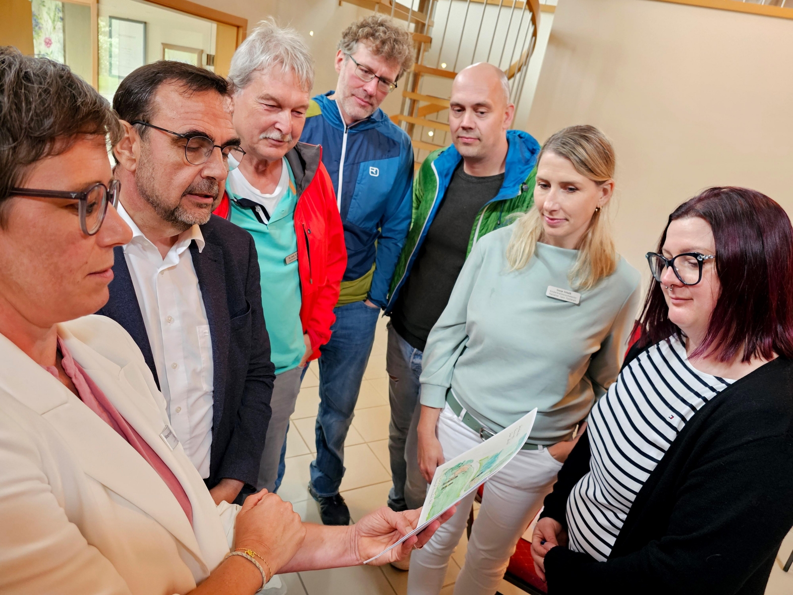 Begutachteten gemeinsam den Entwurf für das neue Sternenkinder-Grab, das in unmittelbarer Nähe zum bestehenden Grab am Memminger Waldfriedhof entstehen soll. Im Bild von links: Stephanie Weißfloch (Leiterin Schwangerenberatung Donum Vitae), CSU-Politiker Klaus Holetschek, die Kinderärzte Dr. Ralf Pallacks und André Gatti, Gynäkologe Dr. Maximilian Hütter, Palliative Care Fachkraft Sonja Schalk und Bestattermeisterin Katharina Ettmüller-Hummel.
