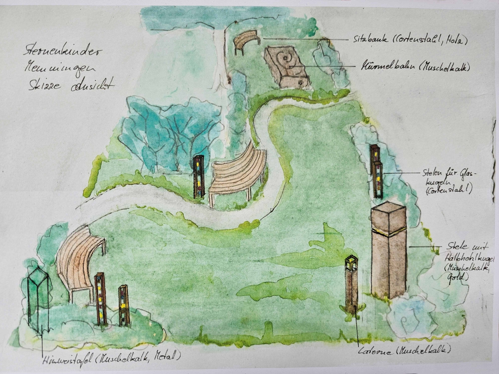 Der Grabentwurf zeigt auf einer rund 50 Quadratmeter großen Fläche verschiedengroße Stelen aus Muschelkalk und Cortenstahl, Sitzbänke zum Verweilen, Laternen und eine steinerne Murmelbahn zum Spielen für Geschwisterkinder.