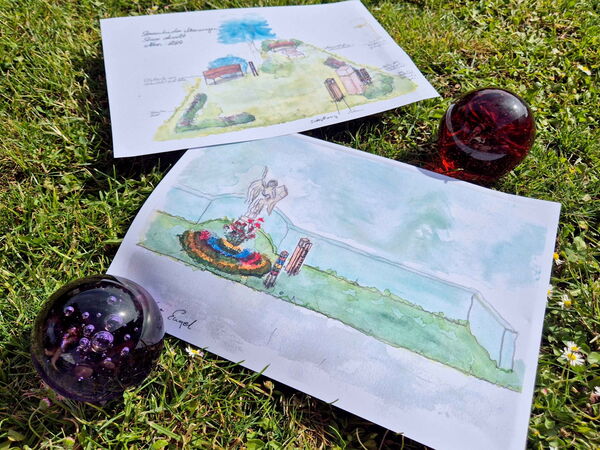 Die Skizze für die Neugestaltung des Sternenkindergrabes am Memminger Waldfriedhof mit Sitzbänken zum Verweilen, einer Murmelbahn für Geschwisterkinder und Glaskugelstelen, in die bunte Kugeln mit den eingravierten Namen der verstorbenen Kinder eingelassen werden können. Skizze: Lioba Abrell