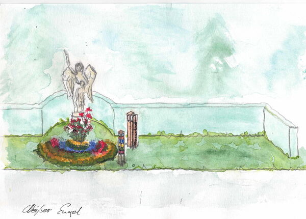 Die Skizze zeigt, wie das bestehende und in die Jahre gekommene Sternenkinder-Grab „Weißer Engel“ verschönert werden soll. Unter anderem soll es künftig eine Stele geben (rechts vorne), in die bunte Glaskugeln mit Namen der verstorbenen Kinder eingelassen werden sollen. Skizze: Lioba Abrell