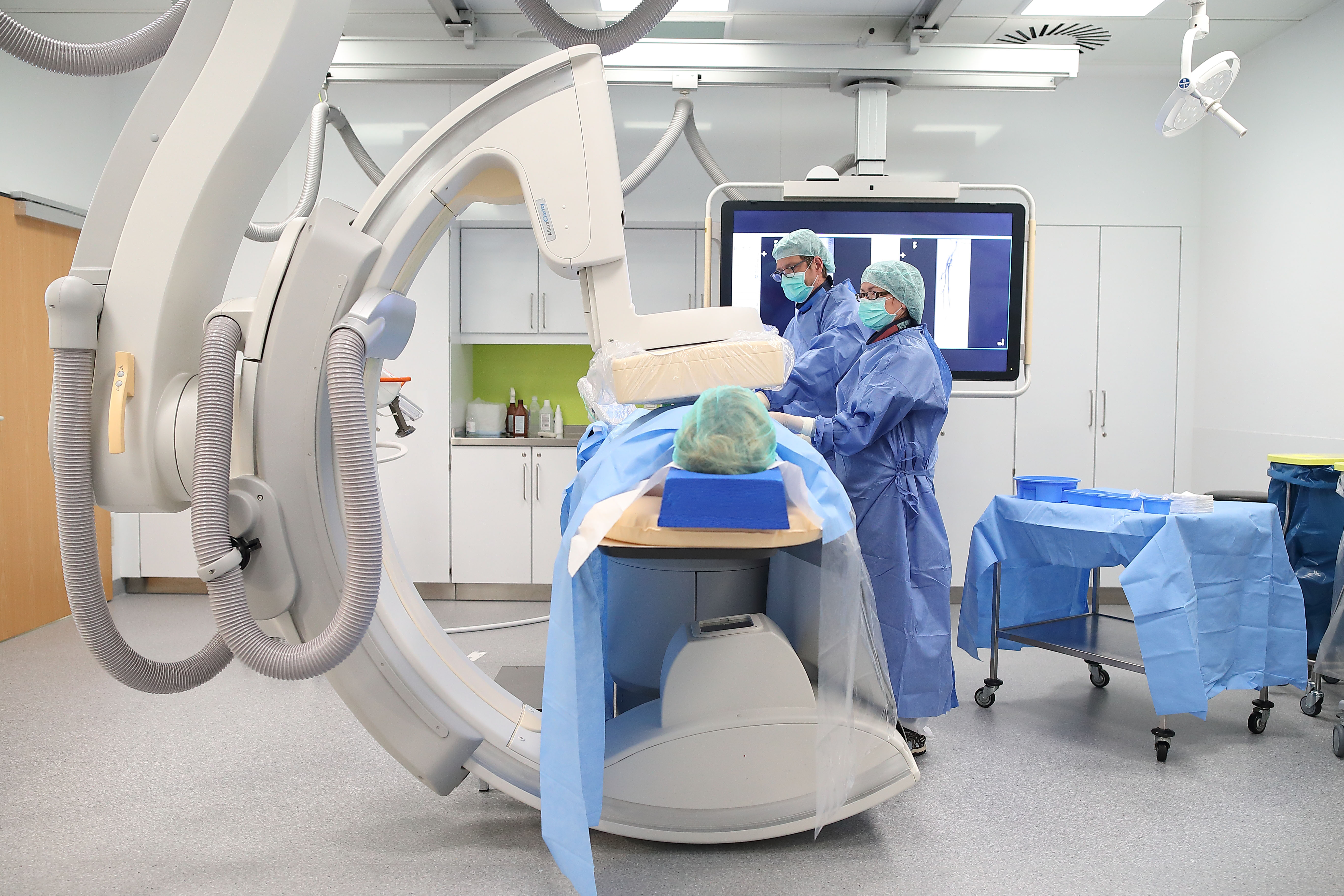 Die neue Angiographieanlage im Erdgeschoss des Klinikums besteht aus einem beweglichen Untersuchungstisch und einem C-förmigen Bogen, an dessen einem Ende eine Röntgenröhre und am anderen ein Bilddetektor montiert ist. Mit Hilfe des Geräts können die Gefäße eines Patienten sichtbar gemacht werden. Dabei wird Kontrastmittel in eine Vene oder Arterie gespritzt und diese mit Hilfe von Röntgenstrahlung dargestellt. Während der Untersuchung wird der C-Bogen um den Patienten oder entlang des Patienten bewegt, um die Gefäße aus verschiedenen Betrachtungswinkeln zu erfassen.